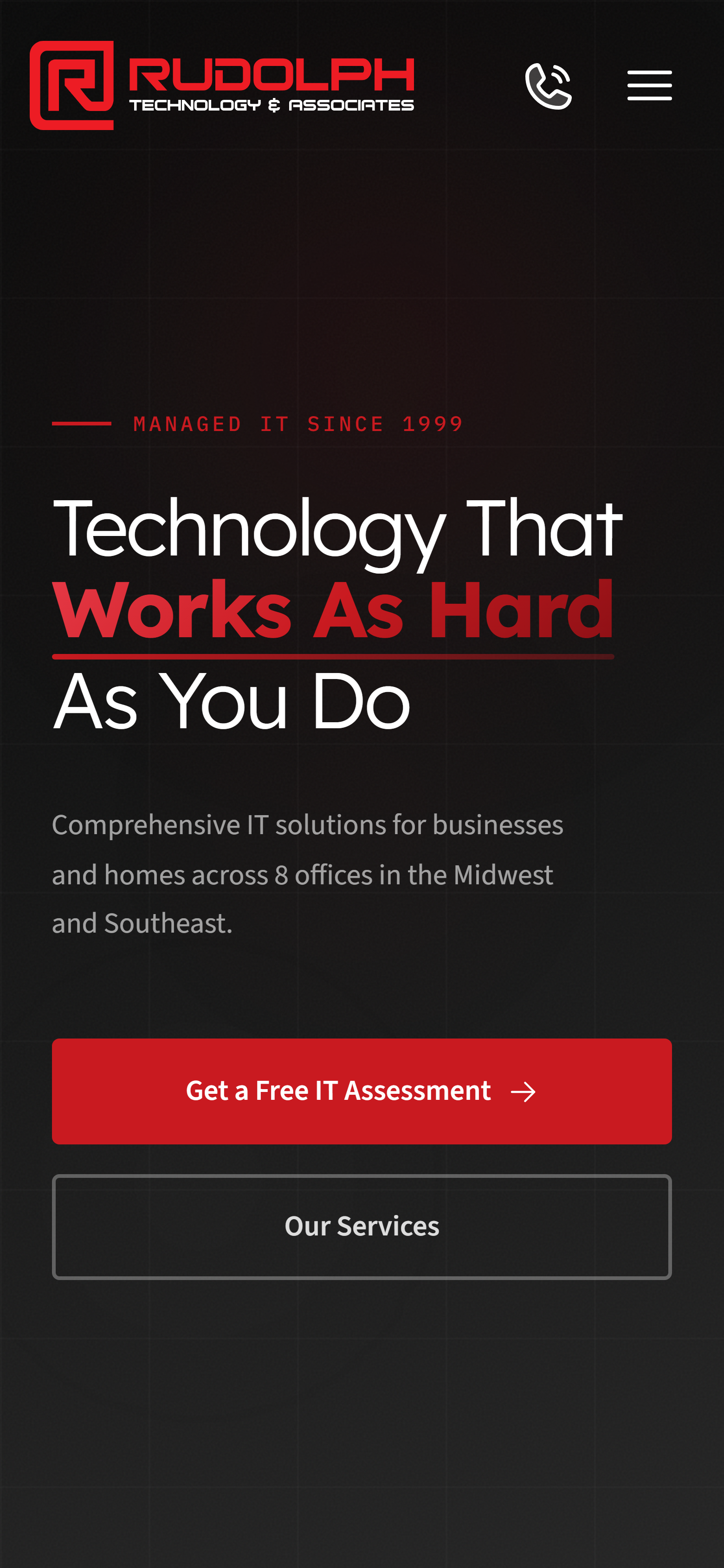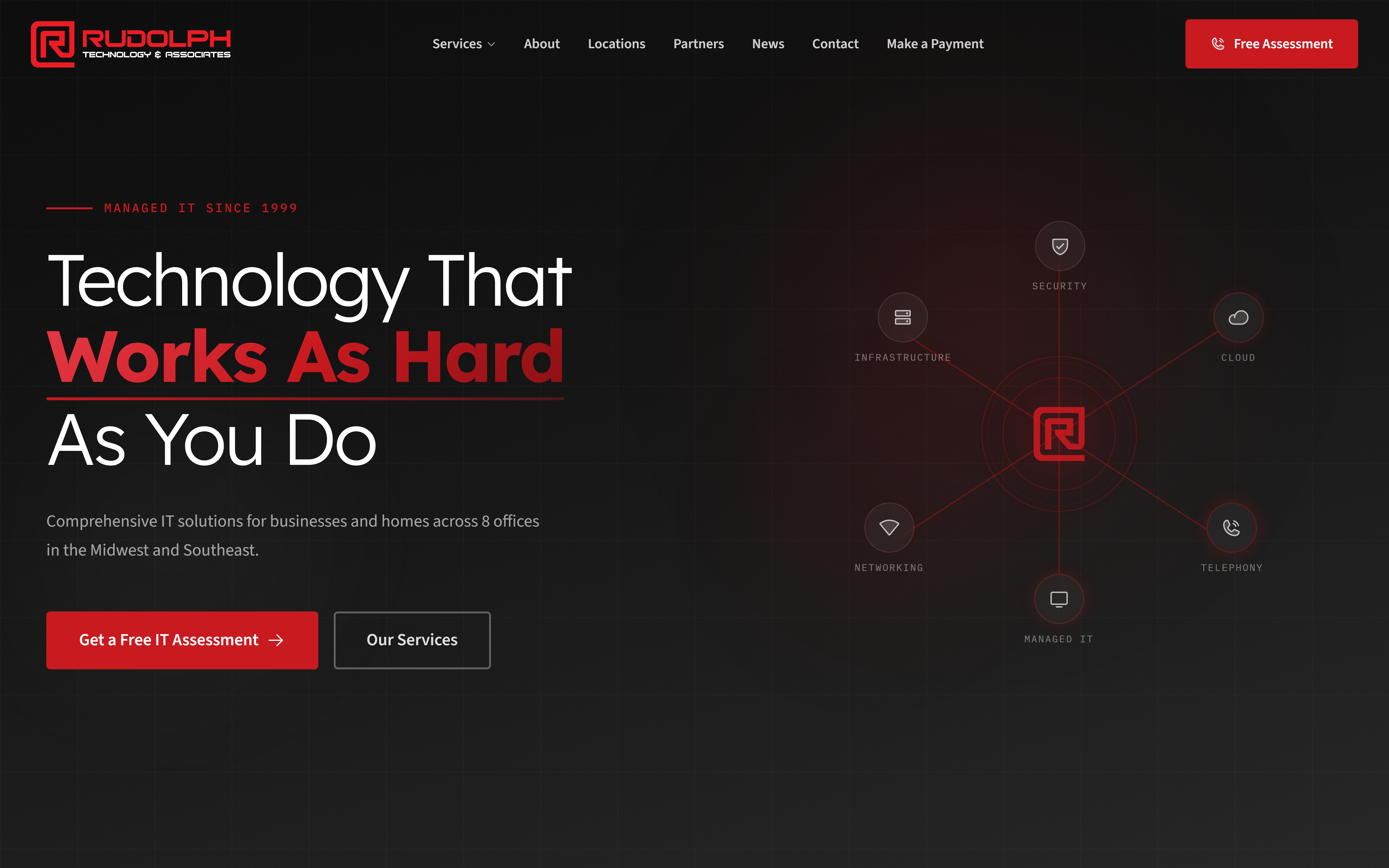 Rudolph Technology & Associates is a managed IT services firm headquartered in Ann Arbor, Michigan with eight regional offices across the Midwest and Southeast. Since 1999, they have acted as a "Personal CIO" for businesses and homes, handling managed IT, cloud infrastructure, security systems, telephony, and home automation. Their existing web presence had not kept pace with the scope of the business.